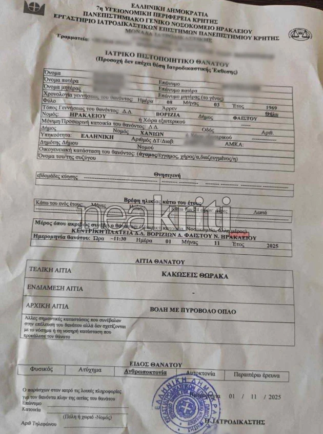 Στο πιστοποιητικό θανάτου της αναφέρεται ως αιτία θανάτου «βολή από πυροβόλο όπλο».