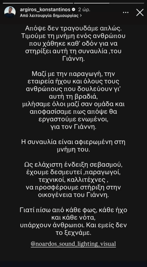 «Η συναυλία είναι αφιερωμένη στη μνήμη του. Ως ελάχιστη ένδειξη σεβασμού, έχουμε δεσμευτεί, παραγωγοί, τεχνικοί, καλλιτέχνες, να προσφέρουμε στήριξη στην οικογένεια του Γιάννη. Γιατί πίσω από κάθε φως, κάθε ήχο και κάθε νότα, υπάρχουν άνθρωποι. Και εμείς δεν το ξεχνάμε», καταλήγει ο Κωνσταντίνος Αργυρός πριν τη συναυλία του το βράδυ του Σαββάτου.