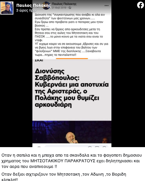 «Όταν η σαπίλα και η μπόχα από τα σκάνδαλα και το φαγοπότι δημοσίου χρήματος του ΜΗΤΣΟΤΑΚΙΚΟΥ ΠΑΡΑΚΡΑΤΟΥΣ έχει δηλητηριάσει και τον αέρα που αναπνέουμε!!