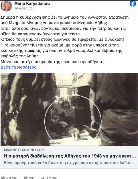 «Σήμερα η κυβέρνηση ψηφίζει το Μνημείο του Αγνώστου Στρατιώτη από Μνημείο Μνήμης να μετατραπεί σε Μνημείο Λήθης.