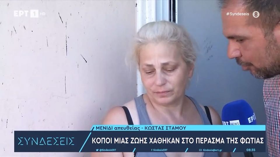 Ο ρεπόρτερ της ΕΡΤ, Κώστας Στάμου, συνάντησε μία κάτοικο στο Μενίδι, που είδε τις φλόγες να μπαίνουν στο σπίτι της και να καταστρέφουν τους κόπους μιας ζωής. Η κυρία Αλεξάνδρα, σε άσχημη ψυχολογική κατάσταση, περιγράφει τις εφιαλτικές ώρες που έζησε το πρωί της Πέμπτης.