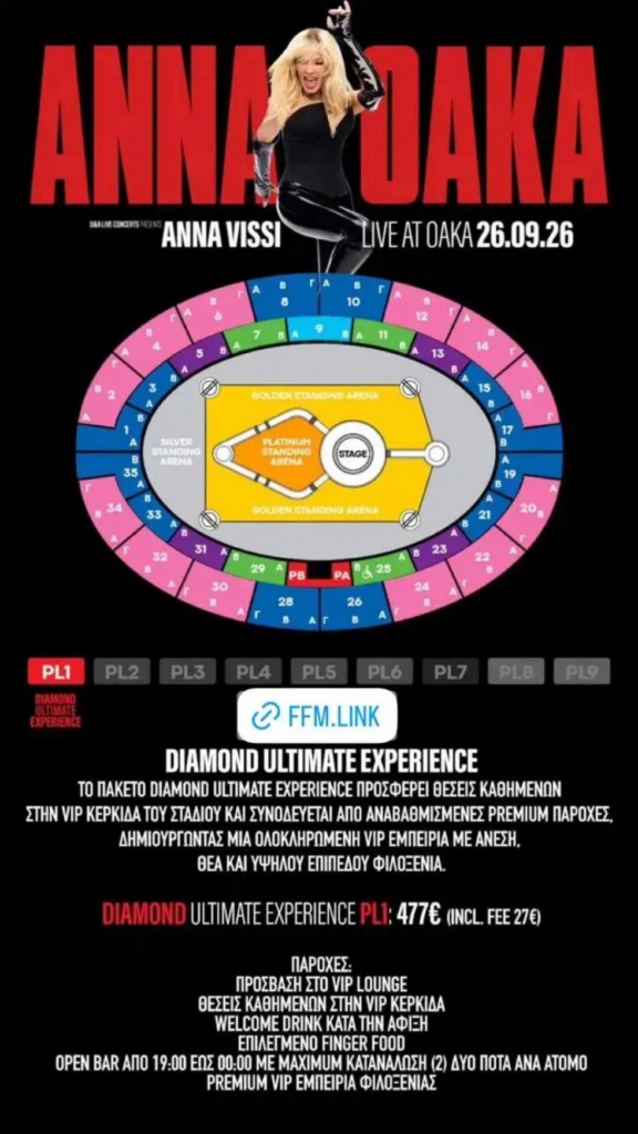 Η ακριβότερη επιλογή είναι το πακέτο diamond ultimate experience, με τιμή 477 ευρώ, το οποίο περιλαμβάνει θέσεις στην VIP κερκίδα και πρόσβαση σε επιπλέον παροχές, όπως VIP Lounge, welcome drink, επιλεγμένο finger food και open bar από τις 19:00 έως τις 00:00, με μέγιστη κατανάλωση δύο ποτών ανά άτομο